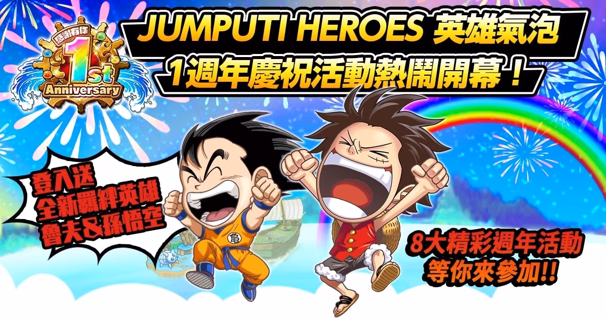 為了感謝玩家們一直以來的支持,在一週年活動期間特別推出了 8 大精彩活動,不僅要讓玩家能輕鬆簡單的免費帶回眾多紀念角色,更要讓玩家能腦力激盪,徹底享受英雄氣泡所營造出的 JUMP 嘉年華世界!
