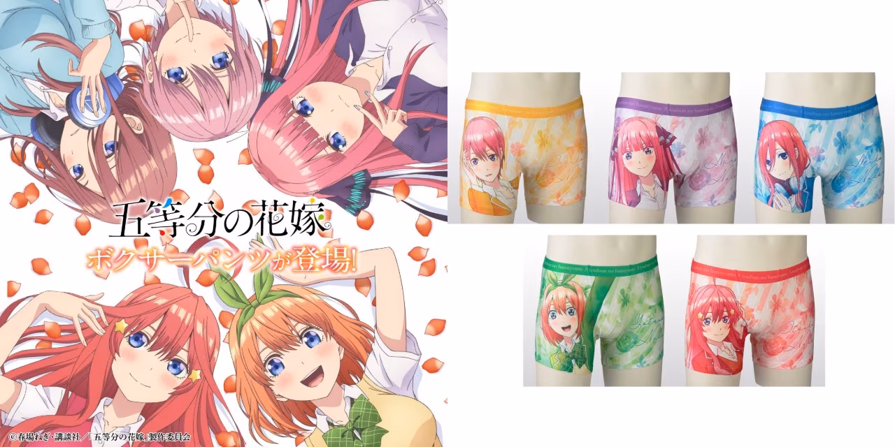 日本萬代 BANDAI FASHION COLLECTION 推出《五等分的新娘》平口內褲(五等分の花嫁 ボクサーパンツ),不用選了,我全都要💕 以人氣戀愛喜劇《五等分的新娘》漫畫中五位女主角的形象設計,搭配上舒適的材質,一花、二乃、三玖、四葉和五月,今天要穿哪一件呢~ 大人問題大人解法,既然選不出來,全包就沒有黨爭問題惹! 「五等分的新娘 平口內褲」系列參考售價為 3,850 日圓(約新台幣1075 元),目前已在 BANDAI PREMIUM 官網開放預購,發貨日為 2020 年 8 月。