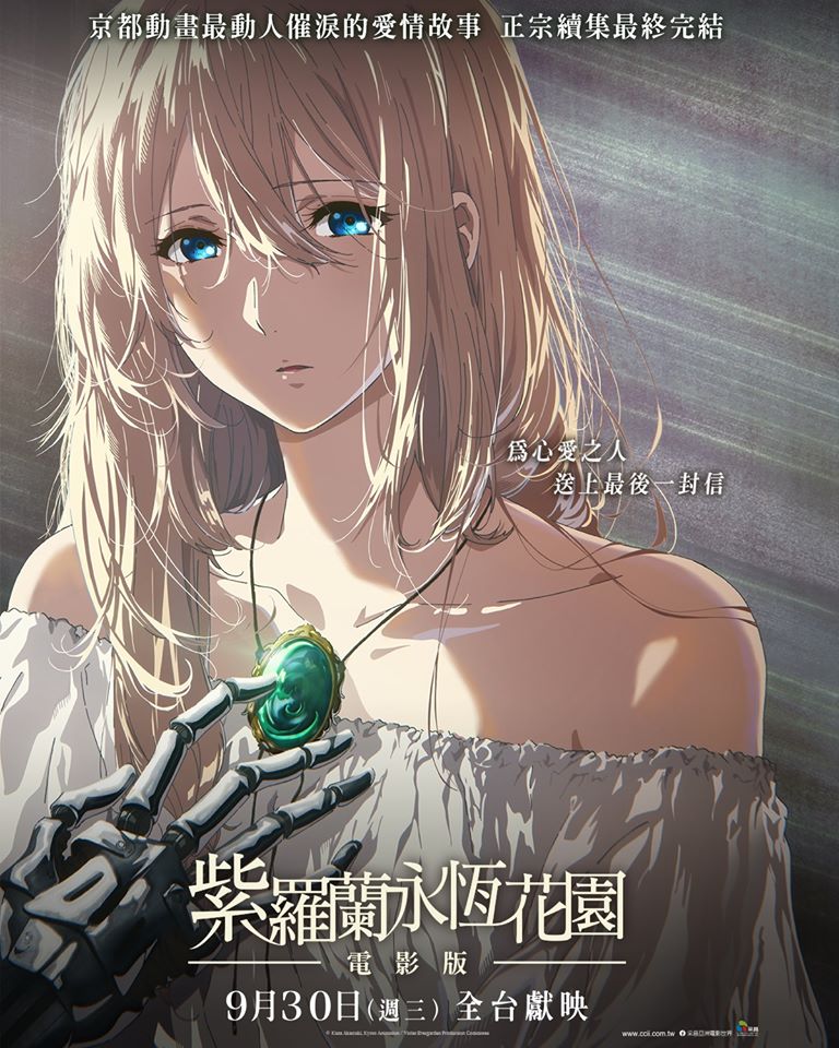 由日本京都動畫製作的《紫羅蘭永恆花園電影版》,先前受武漢肺炎(COVID-19,新冠肺炎)疫情擴散影響而延檔,日前代理商采昌宣布將在 9 月 30 日於全台戲院上映。