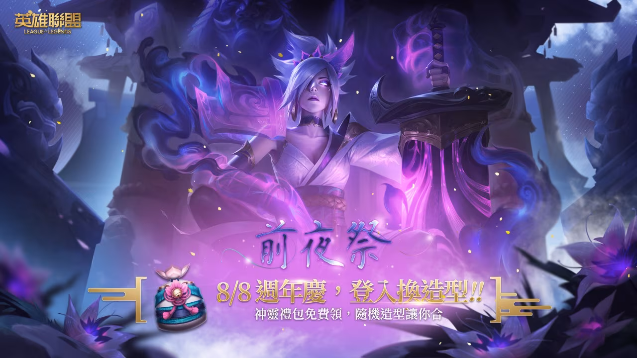 《英雄聯盟》Garena 台港澳週年慶系列活動「前夜祭」開放,玩家只要於 8 月 8 日至 8 月 9 日期間登入遊戲,將能直接領取內含至少六個造型碎片的「神靈禮包」獎勵。同時,「ROG英雄聯盟實況主對抗賽」將在 8/8 舉行,邀請玩家一同參與!