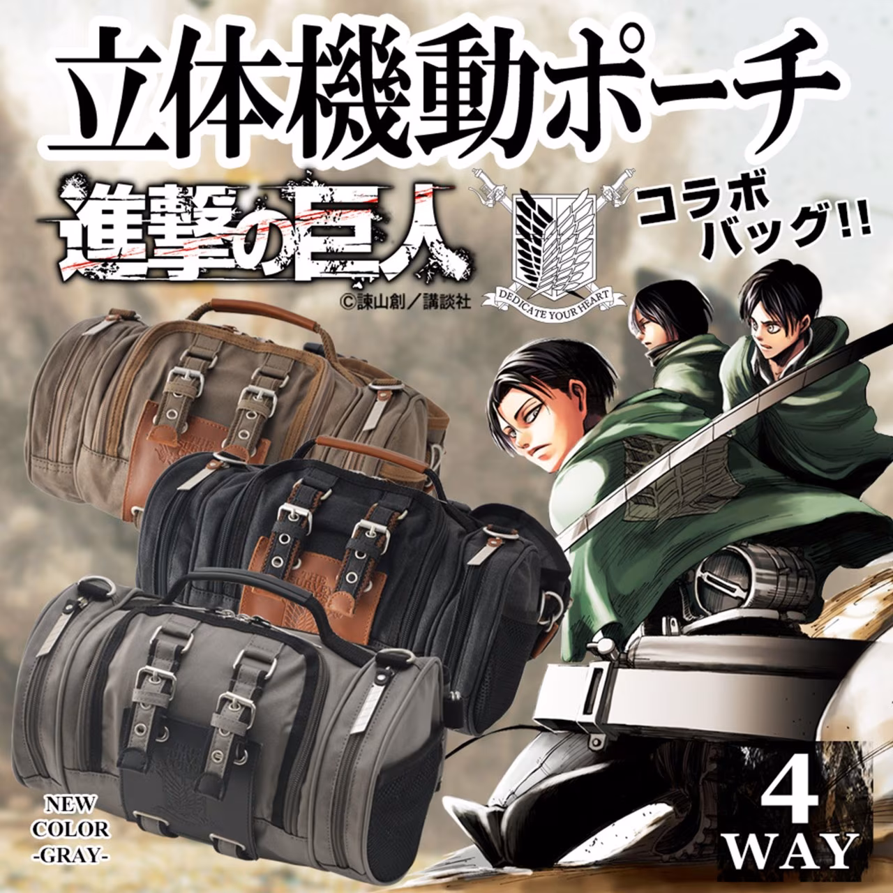 調查兵團能夠在建築間、森林裡、巨人群中穿梭自如,全歸功於立體機動裝置,本次推出的四種包款「四用腰包、後背包、側背包、大腿包」即是以此為設計概念開發一系列商品。