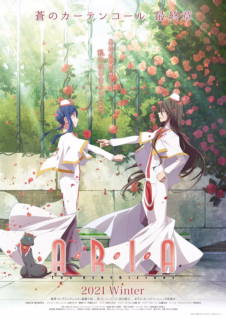 由日本漫畫家天野梢原作的《水星領航員》(ARIA)新動畫系列「ARIA The BENEDIZIONE」將於 2021 年冬季公開。 ARIA The BENEDIZIONE 是《水星領航員》「蒼之謝幕」(蒼のカーテンコール)3 部曲的最終章,主視覺的藍華與晃互相給了一朵玫瑰,故事主軸很有可能是以這兩位姬屋成員為主。 順帶一提,劇場版《ARIA The CREPUSCOLO》正在日本上映中。