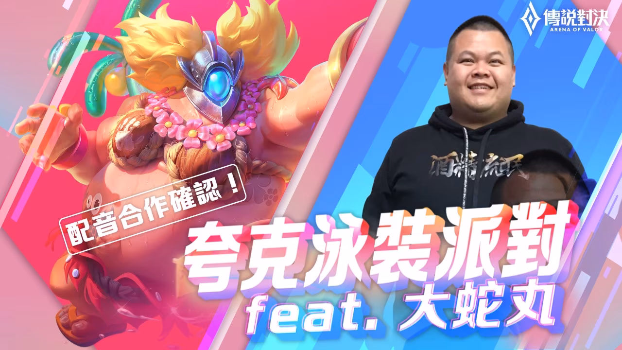 除了趣味的外觀特效設定,在遊戲內語音內容上,《Garena 傳說對決》也邀請玩家們一同發揮創意,為「夸克 泳裝派對」量身訂做最詼諧有趣的語音內容,並應玩家要求,特地邀請形象與本次造型相當符合,且本身為傳說對決資深玩家的人氣網紅「大蛇丸」參與配音;