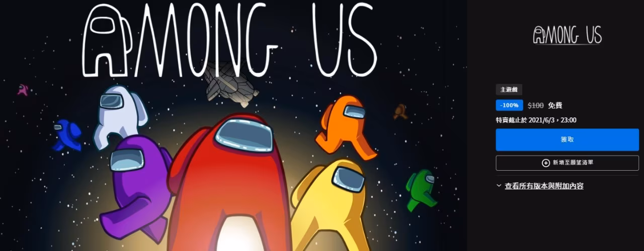 2020 年度人氣獨立大作《Among Us》已於 Epic Games Store 開放限時免費,至台灣時間 6 月 3 日 23:00 截止,領取後即可永久保存至收藏庫。