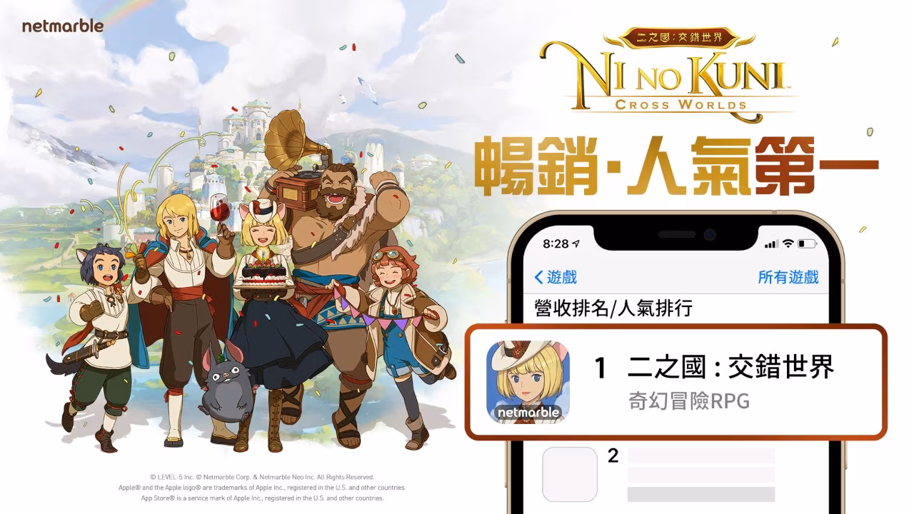 網石公司 Netmarble Corporation 今(9)日宣布,奇幻冒險 RPG 手機遊戲《二之國:交錯世界》昨(8日)上市當天,旋即在台灣和香港的蘋果 App Store 拿下暢銷排行榜冠軍的殊榮。