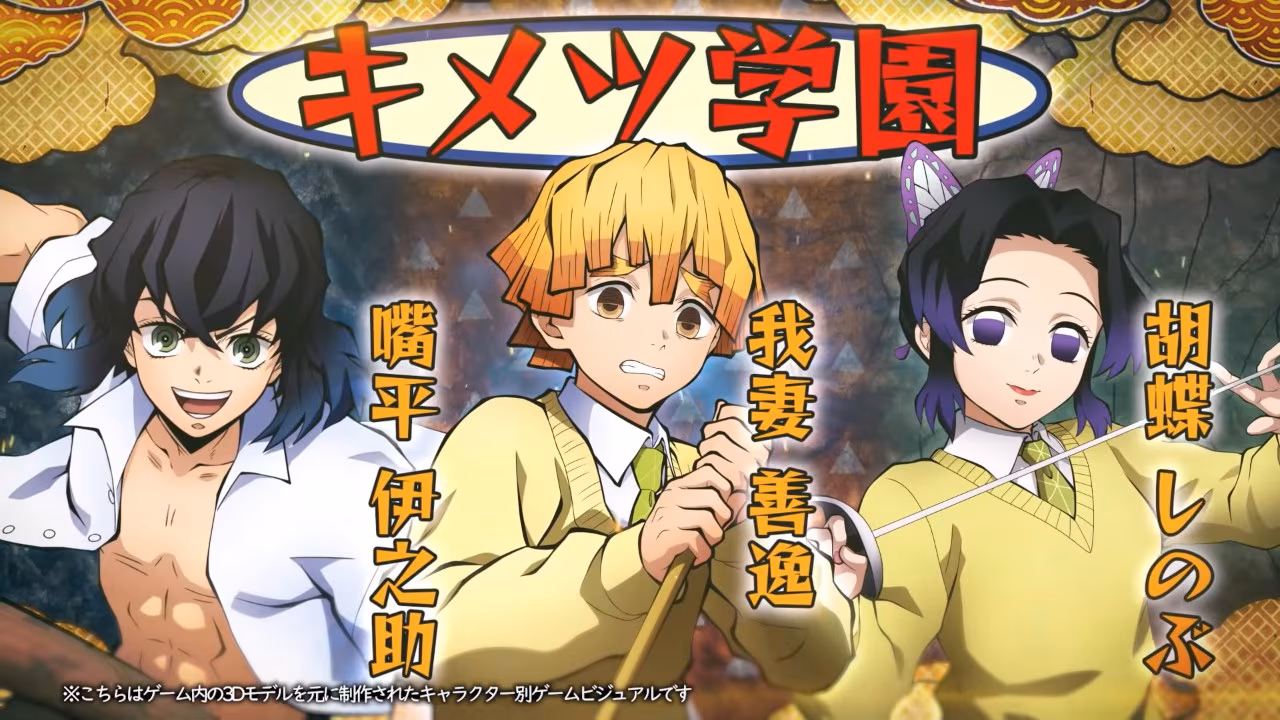 由 CyberConnect2 製作的《鬼滅之刃》家用遊戲《鬼滅之刃 火之神血風譚》將於年內發售,已公開新角色:外傳「鬼滅學園」(暫譯,原名中高一貫!!キメツ学園物語)的我妻善逸、嘴平伊之助、胡蝶忍。(影片僅限日本 IP 觀看)