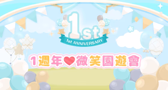 為了迎接遊戲一週年,居住在微笑小鎮上的三麗鷗角色們決定舉行「微笑園遊會」與居民們提前開始慶祝一週年, 微笑園遊會活動將於 7 月 5 日至 7 月 31 日間舉行, 營運團隊也準備了多樣活動等著與居民同歡一週年!