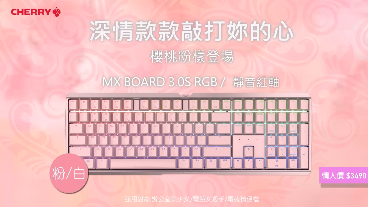 這次 MX BOARD 3.0S 靜音紅軸引進了原本的象牙白色系,連女性玩家喜愛的粉紅色系也一併引進台灣,粉紅色系除了 CHERRY 原廠鍵帽為粉色之外,連一體成形的鋁合金底座也採用粉色陽極氧化烤漆,也更加強金屬表面耐刮度,顏色也更柔和,整把 MX BOARD 3.0S 的粉紅泡泡肯定會讓更多女性玩家雀躍不己。