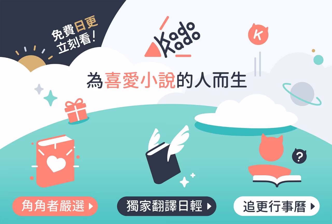 小說連載平台「KadoKado 角角者」正版授權取得日本最新熱門作品,進行在地化優質翻譯,採章節形式輕鬆閱讀,每日都有作品更新章節並提供免費觀看,現在註冊「KadoKado 角角者」會員即享新用戶好禮 50 角點,及指定章節免費試閱,報名社群推坑募集活動可再抽閱讀金 2,000 角點。