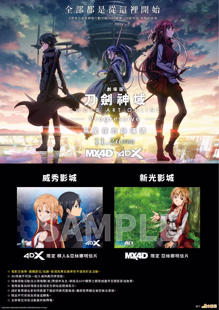 官方同步公開專屬 4D 系列觀影的特典,4DX 版為亞絲娜和桐人的限定圖卡,MX4D 版則是亞絲娜在安全區域內小憩的限定圖卡,每張票均可兌換乙張。