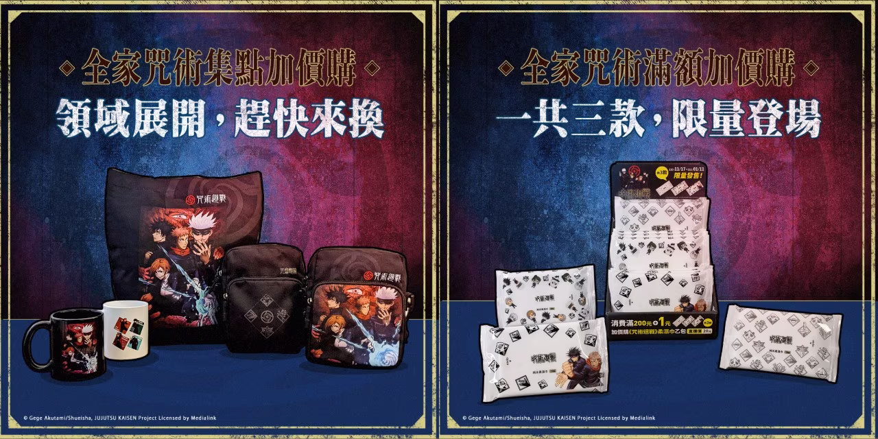 動漫代理羚邦集團與全家便利商店合作推出《咒術迴戰》「咒術集點加價購主題集點活動」,即日起至 12 月 14 日可使用點數加價換購生活用品週邊。 此次以《咒術迴戰》主角群為首,打造一系列集點商品,首推大容量托特手提包,還有側背包、馬克杯馬克杯等。其中合作濕紙巾直購價只要 20 元,或是消費滿 200 元 +1 元就可獲得。 全家「咒術集點加價購主題集點活動」點數門檻與加購金額以門市公告為主。