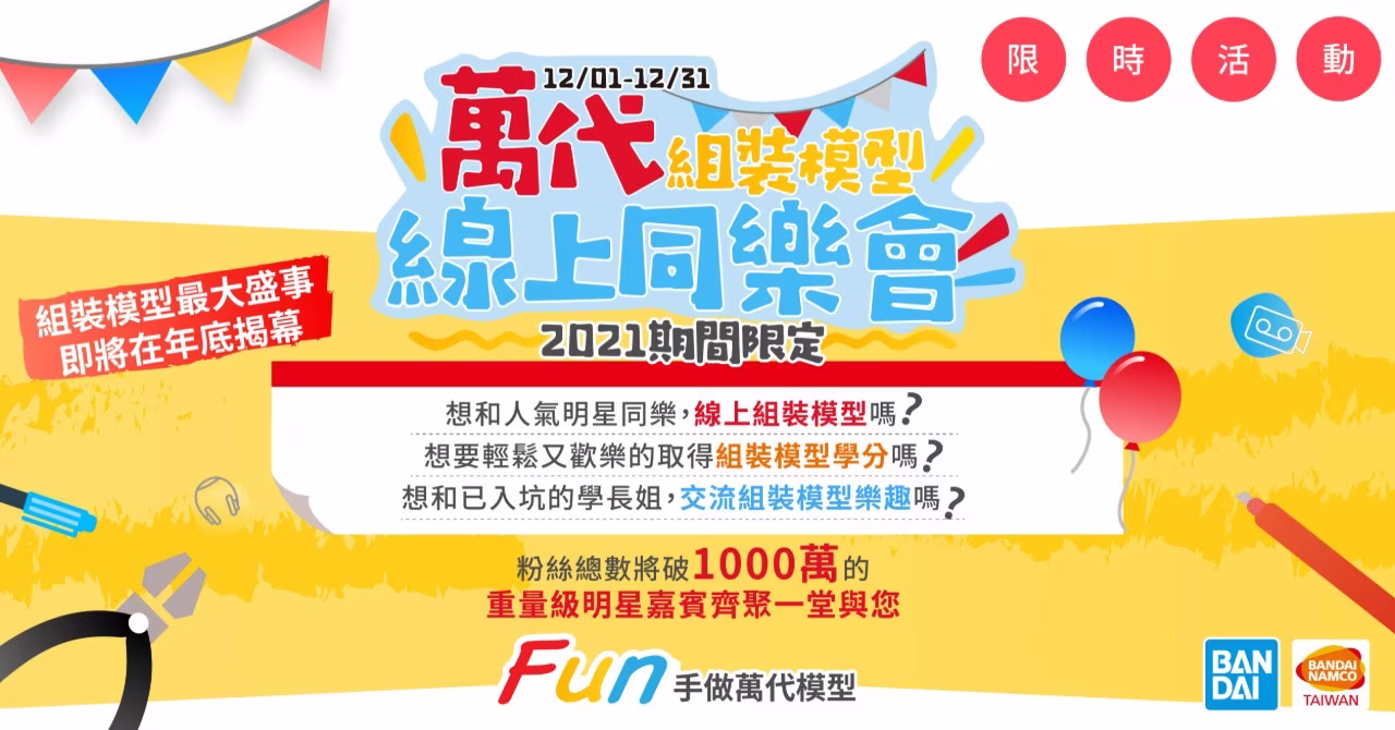 組裝模型年度盛會「萬代組裝模型線上同樂會」即日起歡樂登場,除了邀請多位人氣明星與玩家一起線上組裝模型外,長達一個月時間,每週都有精彩活動等玩家一起參加!