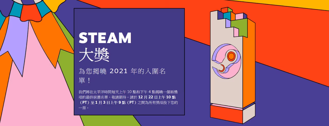 Steam 於今日公開 Steam 大獎的 2021 年的入圍名單(點此連結),玩家可選出今年你認為最棒的 Steam 遊戲,投票日期為台灣時間 12 月 23 日上午 2 點(PT)至 1 月 4 日上午 1 點。以下為本屆入圍名單。