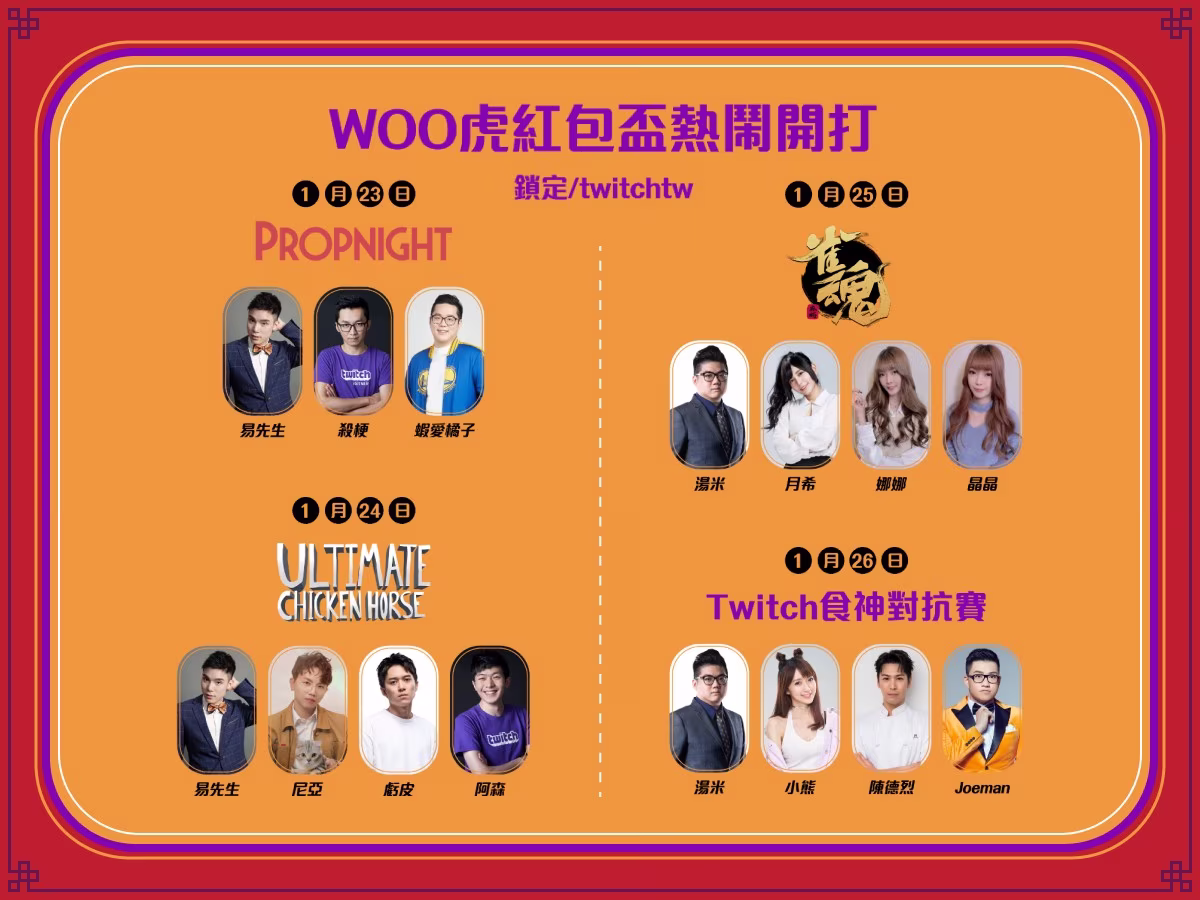 Twitch 新春特別節目《Woo虎紅包迎好年》將從 1 月 23 日至 26 日陪所有觀眾爆笑度過,在四個完全不同的競賽中,讓新觀眾、老觀眾看到 Twitch 上面能夠擁有各種可能,不管是搞笑競賽、爆笑煮菜,只要來到 Twitch 就像回到大家庭一樣可以盡情嘻笑盡情鬧,讓 Twitch 在新的一年繼續陪你歡樂度過。