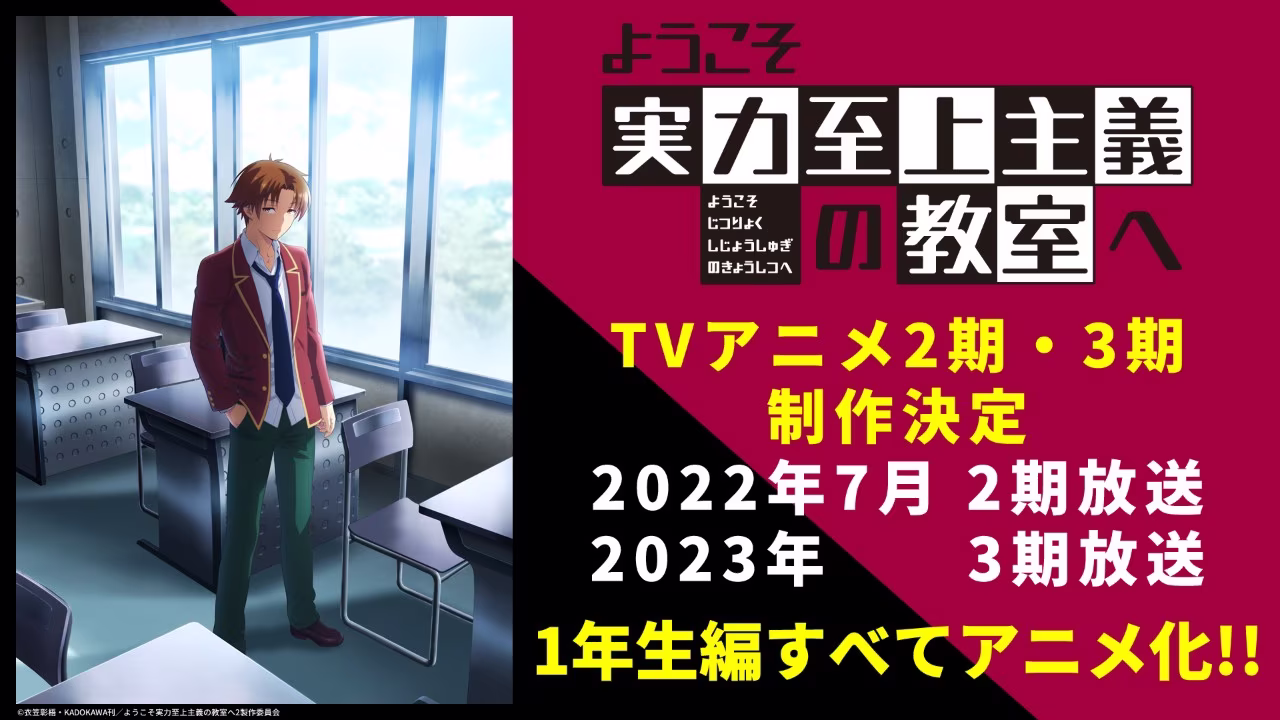 衣笠彰梧輕小說《歡迎來到實力至上主義的教室》改編電視動畫將於今年 7 月推出第二季,2023 年第三季開播,同時宣布 1 年級篇將會全面動畫化,也就是第一季的原作第 4 集加短篇後,截至第 11 集再加兩集短篇的內容。