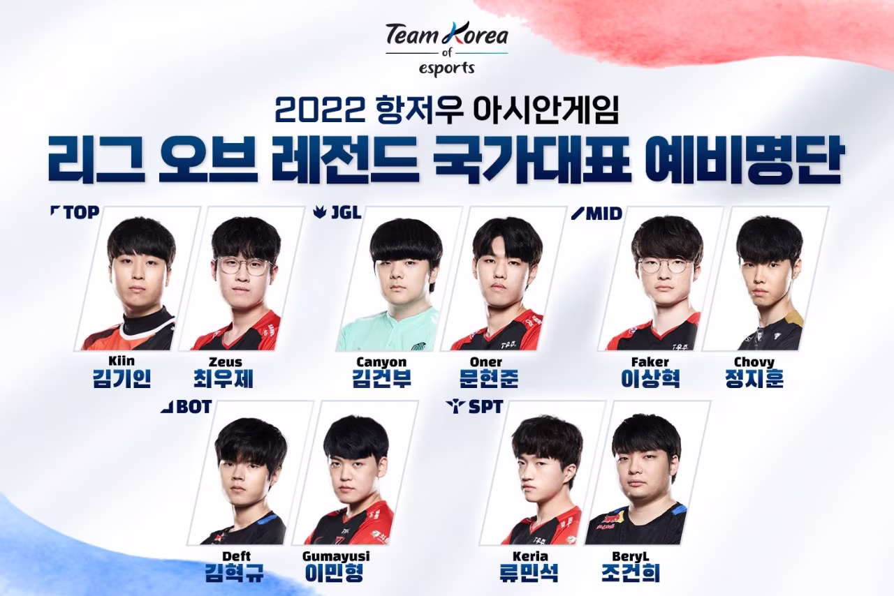韓國電競協會 KeSPA 今(14)日公開杭州亞運《英雄聯盟》代表隊大名單,初選名單五路各有 2 位選手,正式六人名單將在之後透過徵招訓練及試訓賽後決定。