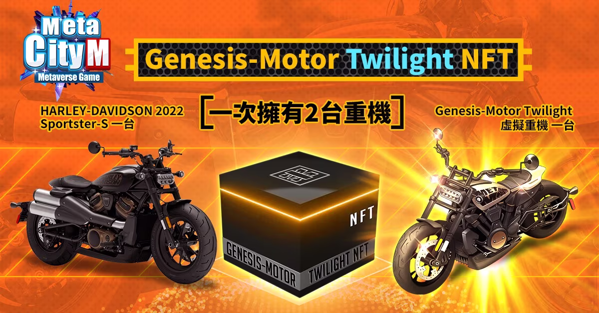 《MetaCity M》將會於 HARLEY-DAVIDSON TAIWAN 4 月 26 日在麗寶國際賽車場舉辦「HARLEY-DAVIDSON 2022 Sportster S」新車上市發表會上,首度將「Genesis-Motor Twilight」NFT 以及實體、虛擬機車同場亮相,與史上最強科技賽跑重機一同強悍登場。