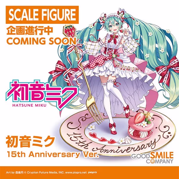 即將於 8 月迎接 15 週年的「初音未來」,日文音 1 與 5 和草莓相同,繪師森倉圓繪製的主視覺中,初音未來以可愛「草莓」為靈感的造型登場,並將推出「黏土人 初音未來15th Anniversary Ver.」以及比例模型。