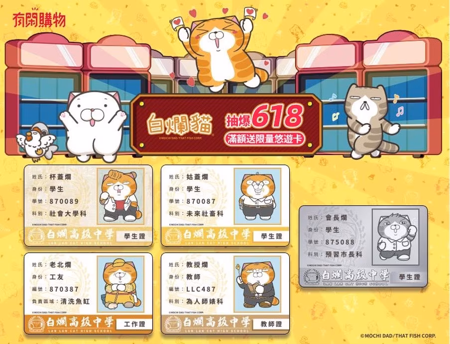 原創 IP 白爛貓在 6 月推出全台限量學生證悠遊卡,白爛貓與有閑購物首次跨界合作,聯手打造 4 款白爛高中學生證+1 款隱藏版悠遊卡,結合有閑獨家線上盲抽創新銷售模式提升消費樂趣。