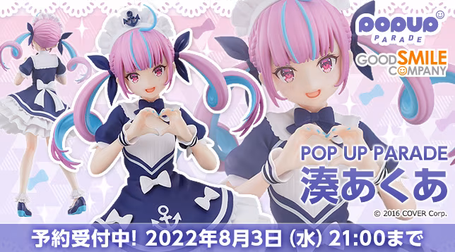 GSC 平價模型「POP UP PARADE」系列以 hololive 所屬 VTuber 虛擬偶像遊戲玩家女僕「湊阿庫婭」化身為模型登場! 「POP UP PARADE 湊阿庫婭」以其公式圖片的模樣 3D 化,再現了手比愛心的甜美樣子。除了立體化呈現衣服上的蝴蝶結,澎裙的皺褶也細膩呈現出生動的樣子。 「POP UP PARADE 湊阿庫婭」已於日本及國際 GOODSMILE 線上商店開放預購,預計出貨日期為 2022 年 11 月,參考售價 5,500 日圓。