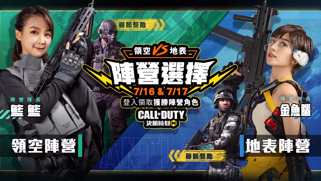 《決勝時刻Mobile - Garena》推出空戰改版,新增載具「戰鬥機」與武器「防空砲」,並邀請知名混血 YouTuber「金魚腦」與高人氣啦啦隊員「籃籃」進行領空與地表的對決,玩家於 7 月 16 日到 7 月 17 日登入即可以獲得獲勝陣營的獎勵。