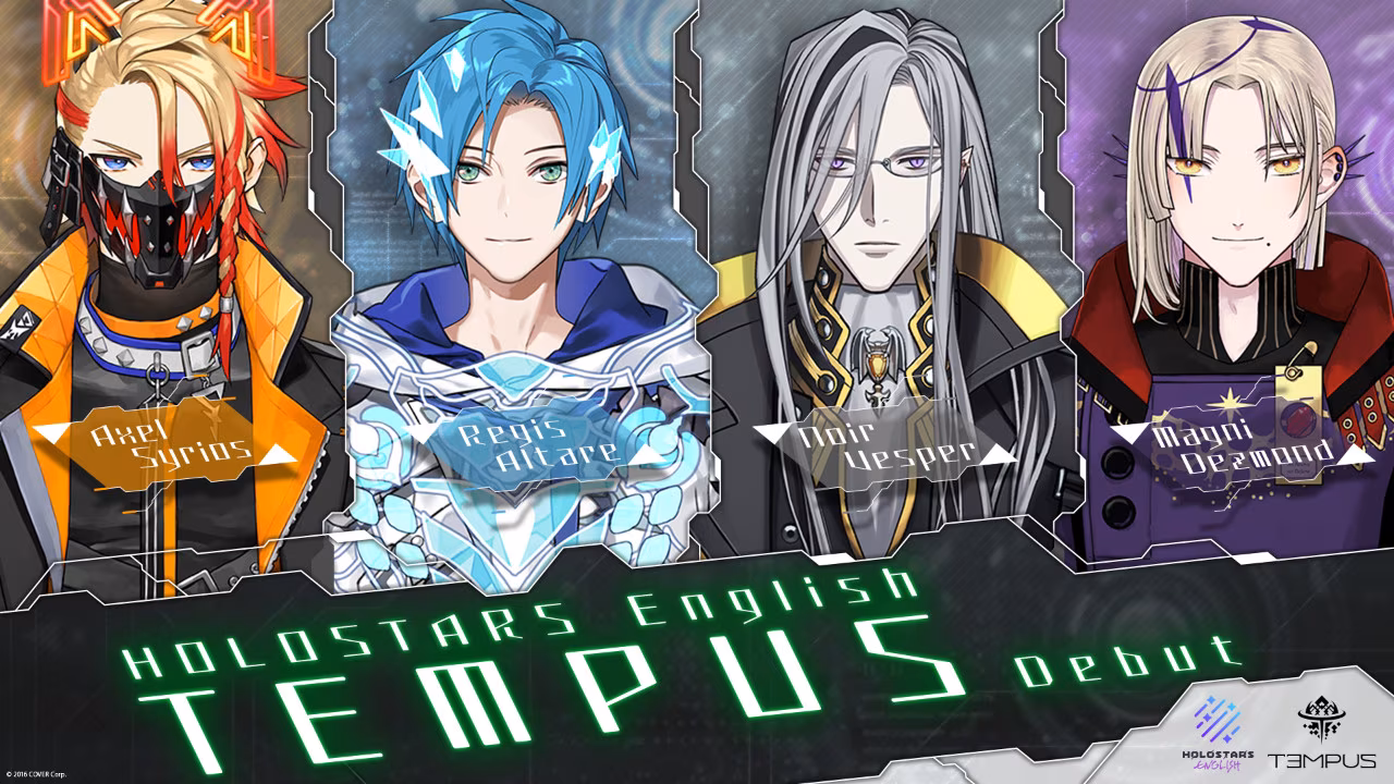 類似「holoX」的秘密結社,這次的四人組合成了冒險者公會「TEMPUS」,共有四位角色,英雄 Regis Altare(繪師:倉花千夏)、鍊金術師 Magni Dezmond(繪師:古海鐘一)、鬥士 Axel Syrios(繪師:ギンカ)、學者 Noir Vesper(繪師:小宮国春)。以下是四位的台灣出道時間。