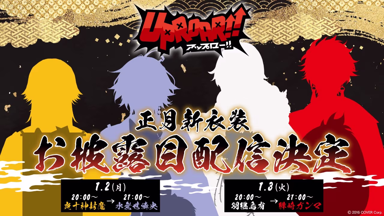 為了迎接新年 UPROAR!! 四人換上了華麗衣裝,本次正月新衣裝揭露直播將於 2023 年 1 月 2 日從夜十神封魔開始,連續二日透過 YouTube 直播公開!