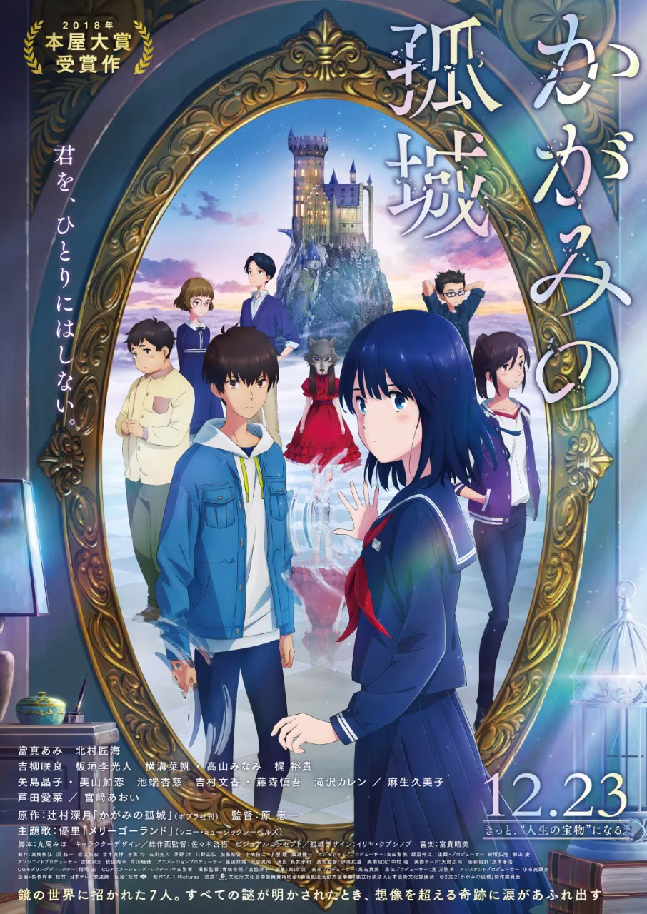 《鏡之孤城》故事講述就讀國中的小心在學校失去容身之處,而關在房間足不出戶,某天她房裡的鏡子突然發出神秘光芒,她被吸入鏡子後,映入眼簾的是一座城堡,以及與自己有類似境遇的另外 6 位國中生。
