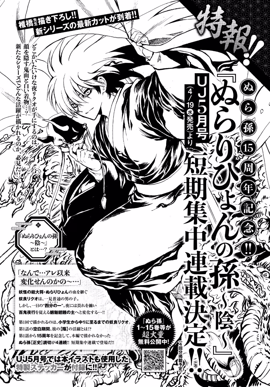 椎橋寬漫畫作品《妖怪少爺》(ぬらりひょんの孫)為迎接漫畫連載 15 周年,將於 4 月 19 日發售的 Ultra Jump 5 月號開始推出新篇《妖怪少爺 ~陰~》共 4 回。