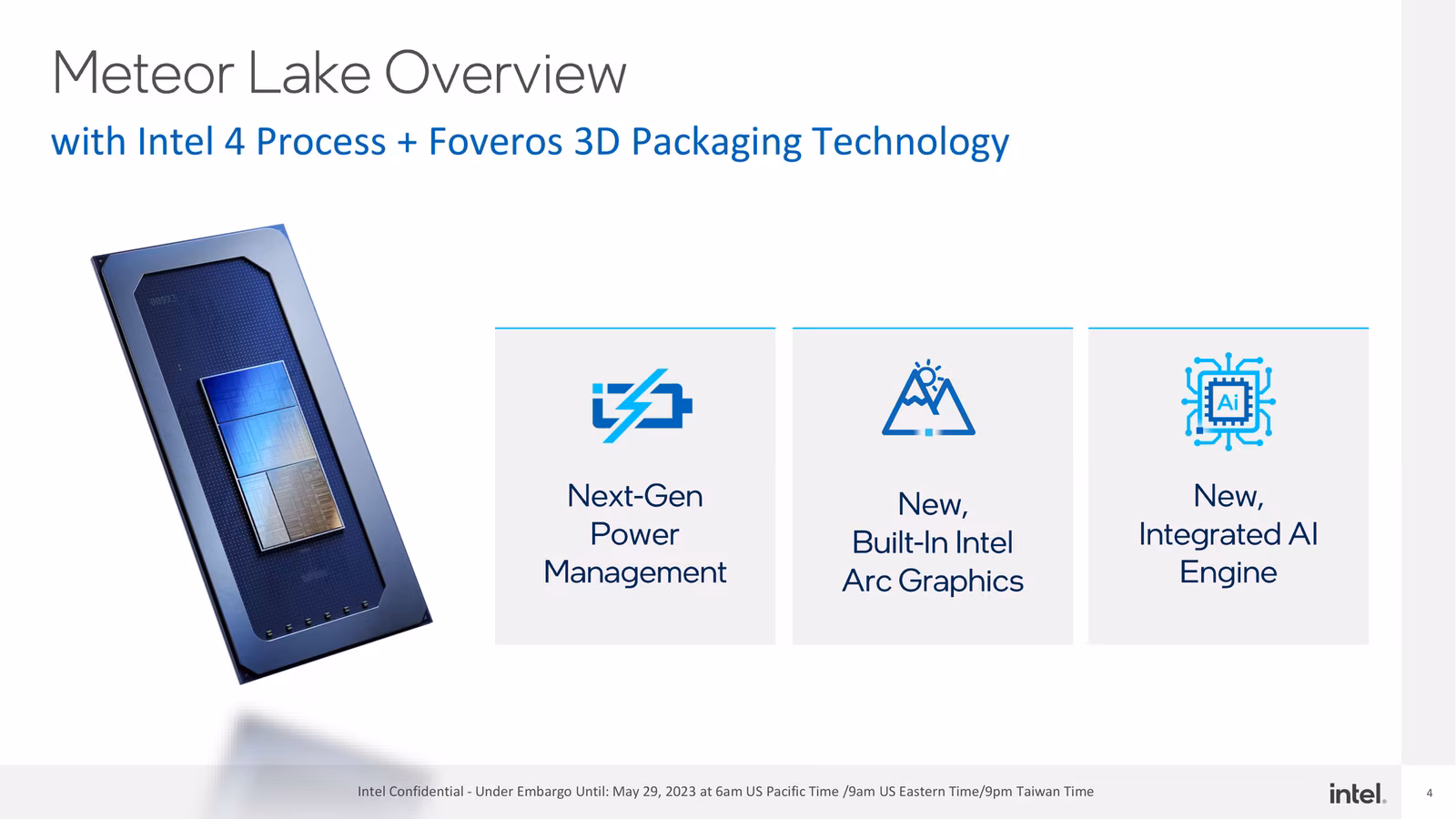 未來將接替 Alder Lake 與 Raptor Lake 的 Meteor Lake 處理器平台預計將使用名為 Intel 4(原 7 nm) 、Intel 20A 的先進製程(External 所指的應該是由台積電代工的 Intel Arc 內顯),搭配 Foveros 3D 封裝技術,進一步強化能源效率之餘,還能提供個人電腦規模的人工智慧運算。