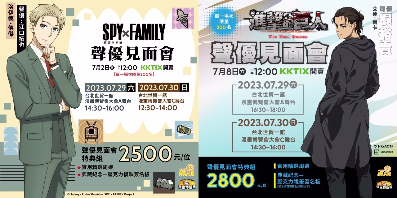 2023 年漫畫博覽會將於 7 月 27 日至 31 日世貿一館隆重登場。動畫代理商木棉花邀請《SPY×FAMILY間諜家家酒》中飾演「洛伊德‧佛傑」的聲優「江口拓也」、《進擊的巨人》中飾演主角「艾連.葉卡」的聲優「梶裕貴」來台與粉絲相見歡!