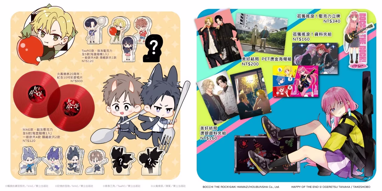 《孤獨搖滾!》將推出小孤獨‧後藤一里的「壓克力立牌」,以及使用珍貴特典圖設計的「資料夾組 2 入」,粉絲千萬不能錯過!而《美好結局》則是「PET 燙金海報組 2 入」與「燙銀資料夾組 2 入」,大方簡約的設計配上作者精緻美圖,非常值得收藏。
