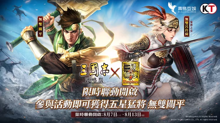 《三國志‧戰略版》和《三國無雙8 empires》聯動活動,將在 8 月 7 日至 13 日舉行,登入遊戲即可獲得無雙關平,兩位聯動武將只有在這個時間內才能獲得。如果你也喜歡無雙系列,這個難得的合作機會可得好好把握。
