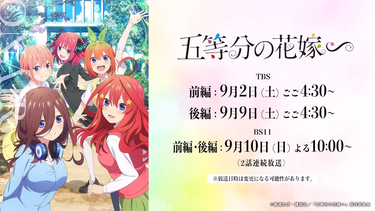 春場蔥戀愛漫畫作品《五等分的新娘》(五等分の花嫁)動畫新作《五等分的新娘∽》在 7 月 14 日於日本地區之電影院先行上映後,預計 9 月 2 日、9 日於 BS11 電視台播出。