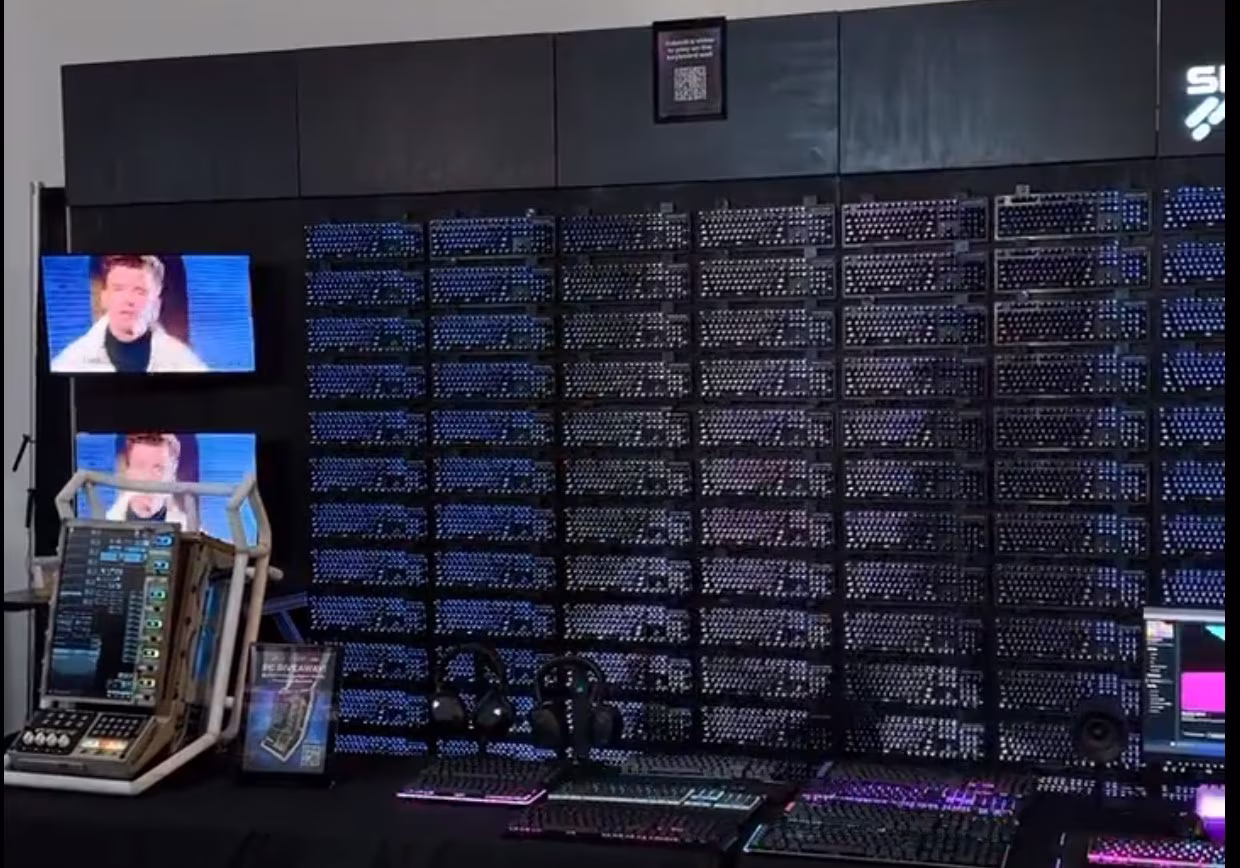這家名叫 SignalRGB 的廠商,主要是專門開發 RGB 燈效控制軟體,在 PAX West 電玩展上將 96 把鍵盤組裝成一面電視牆,用以展示自家軟體傑出的同步控制能力,並將成果放到社群平台上。