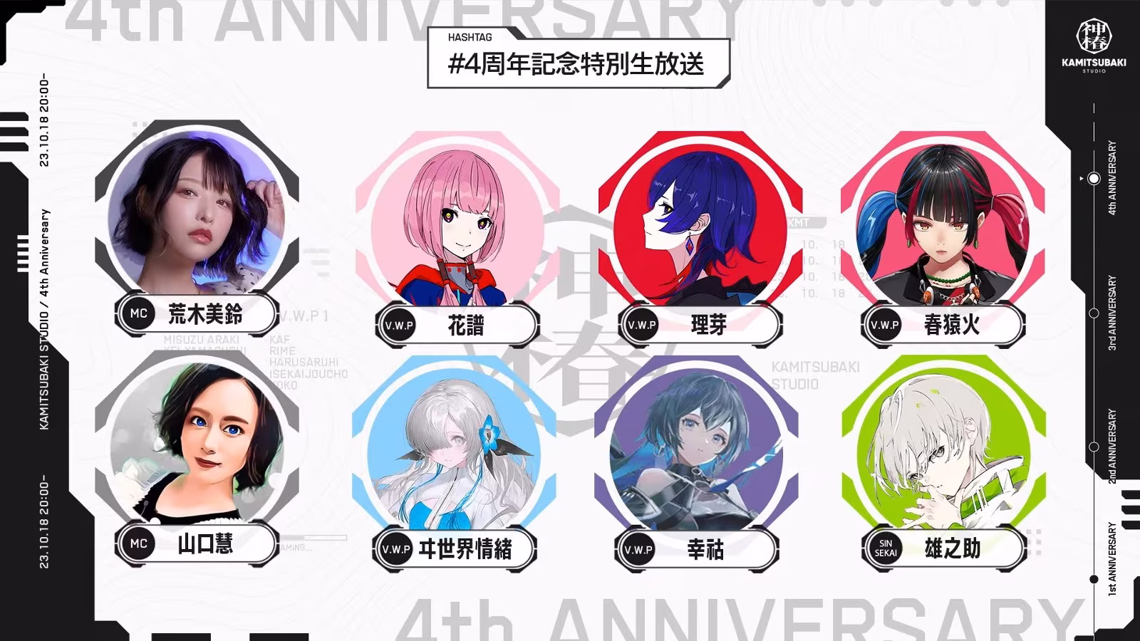 日本創作者經紀公司神椿工作室(KAMITSUBAKI STUDIO)慶祝創立 4 週年,官方頻道昨(18)日進行特別紀念直播,宣布旗下深脊界唱片(SINSEKAI RECORD)多位創作者,以及花譜、理芽、CIEL 等 Vsinger 的演唱會、新專輯等發行情報。
