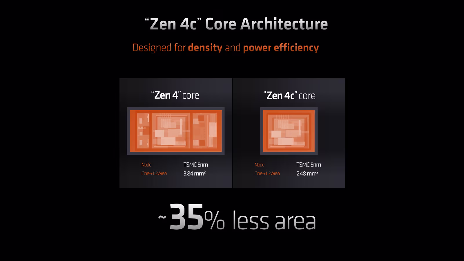 AMD 表示,Zen 4c 的指令集、IPC 效能、SMT 超執行緒等各項指標皆與 Zen 4 相同,製程也是 TSMC 台積電 5nm,但 Zen 4c 的晶片面積更為緊湊,核心 + L2 快取的面積比 Zen 4 架構的 3.84 mm2 縮小了 35%,只有 2.48 mm2。