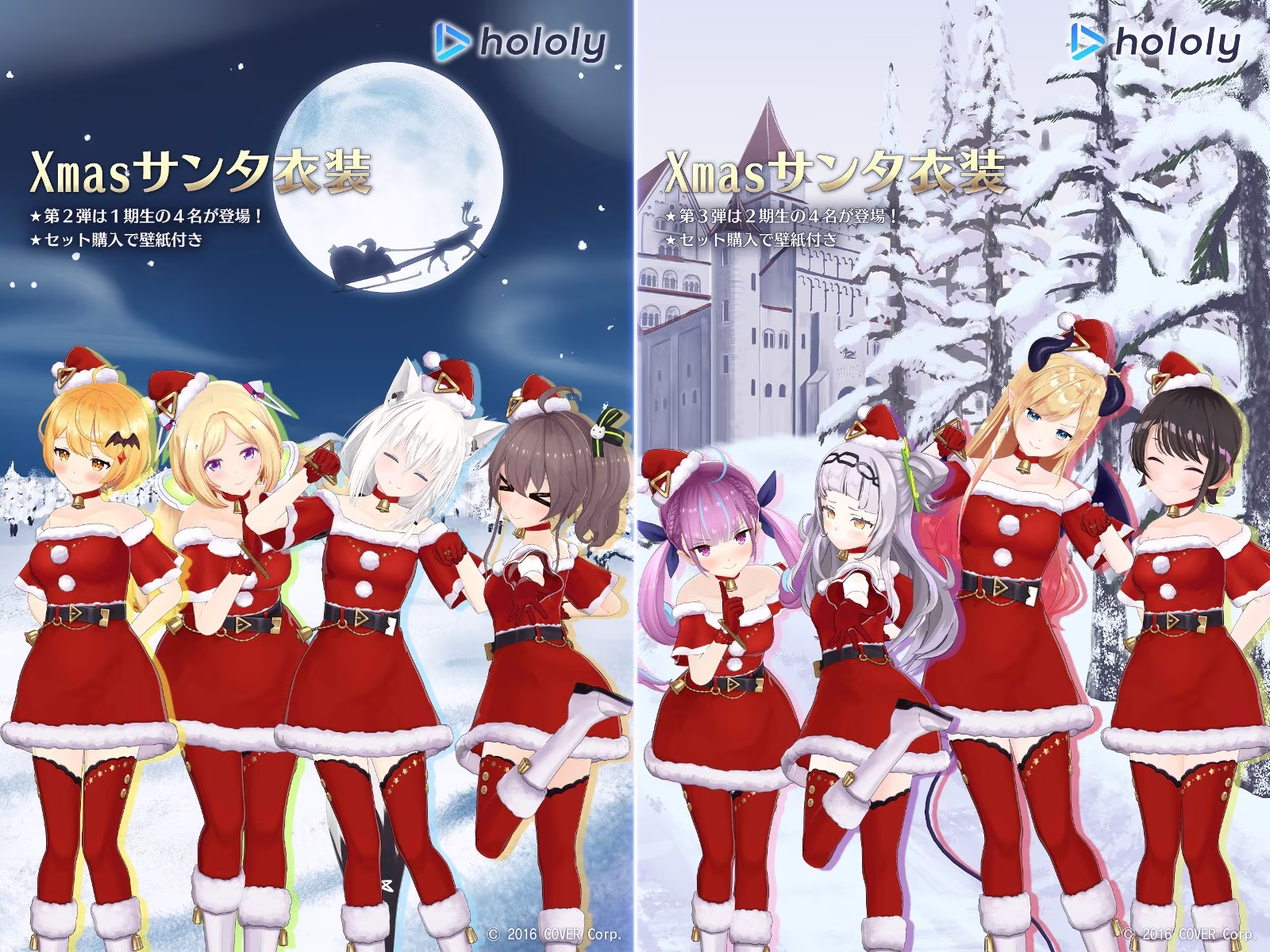 官方曾於 10 月 31 日宣布第一彈 Xmas 應景造型,零期生 5 人時乃空、蘿蔔子、AZKi、星街彗星、櫻巫女各換上火辣聖誕裝,如今 1、2 期生各四名成員也接續登場。