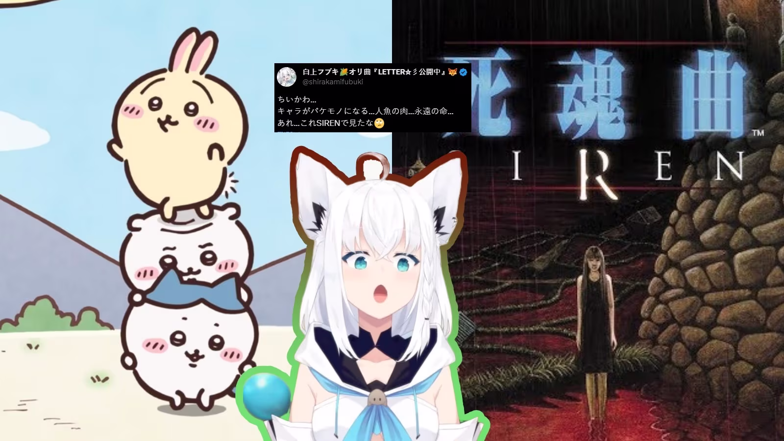 可愛療癒《吉伊卡哇》的超展開劇情,與畫面黯淡、氣氛絕望《死魂曲》的劇情有許多重疊之處,形成 X 趨勢 #人魚の煮付け、#人魚の肉等標籤,漫畫家平野耕太和 VTuber 白上吹雪也加入討論。