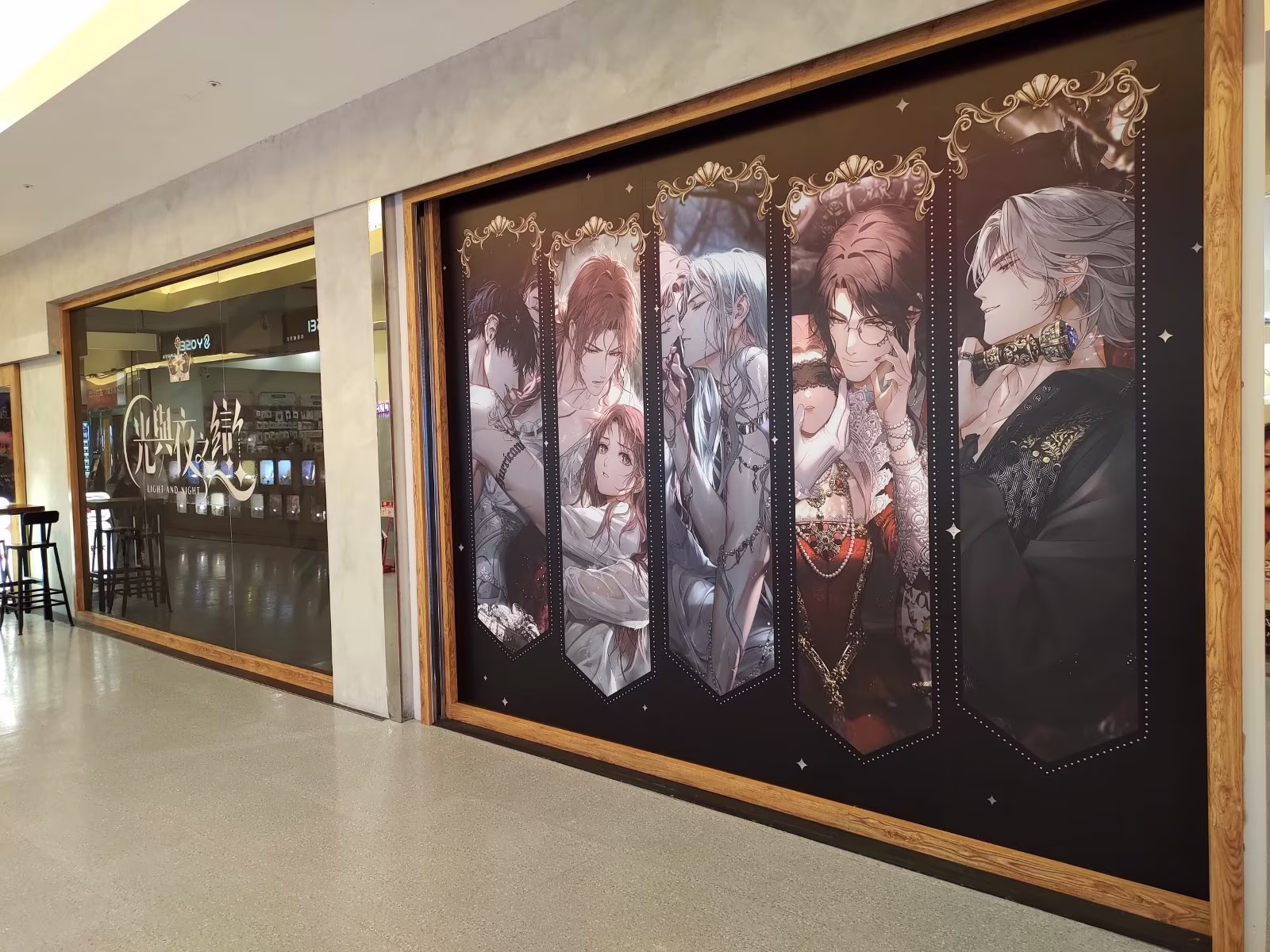 本次店內特別打造成《光與夜之戀》遊戲內活動主題「奈特蘭王國」,並展出深受喜愛的「慾海狂瀾」系列立繪與造型佈置,除了 Q 版立牌小場景區,還有五位男主角的大立牌可以一同合照。