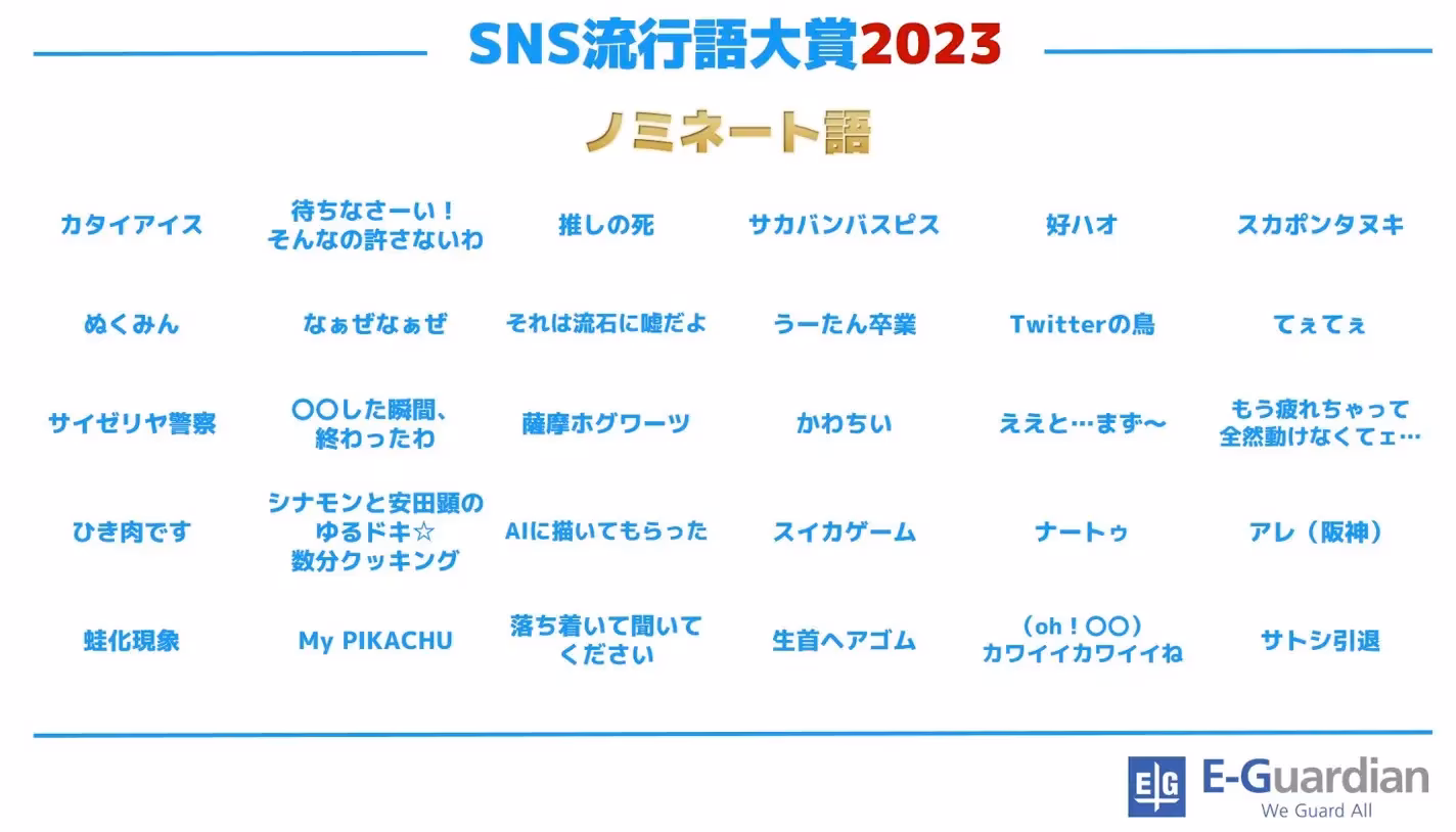 由日本 E-Guardian 統計的 2023 年 X(舊稱 Twitter)常用字彙排名「2023 日本 SNS 流行語大賞」近期公開入圍名單,統計範圍從 2023 年 1 月 1 日至 2023 年 10 月 31 日,預計 11 月下旬公布大獎得主。