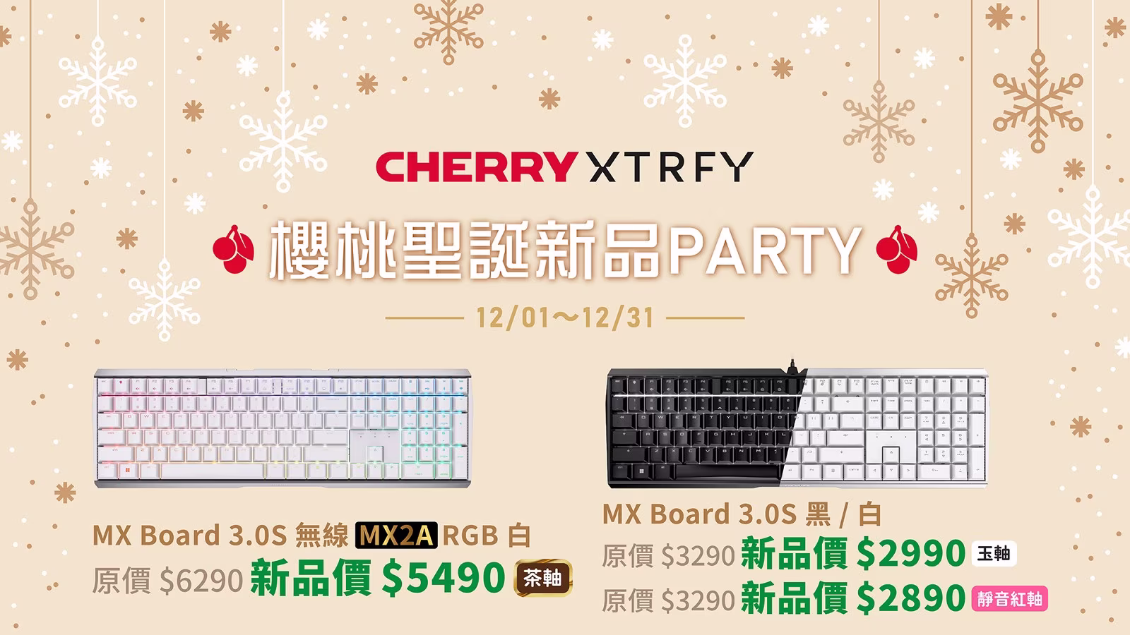 趕在 12 月聖誕節前推出,搭配 MX2A 軸體的就是無線 MX BOARD 3.0S MX2A 白色茶軸版,這把鍵盤也是許多玩家敲碗的無線電競機械式鍵盤。