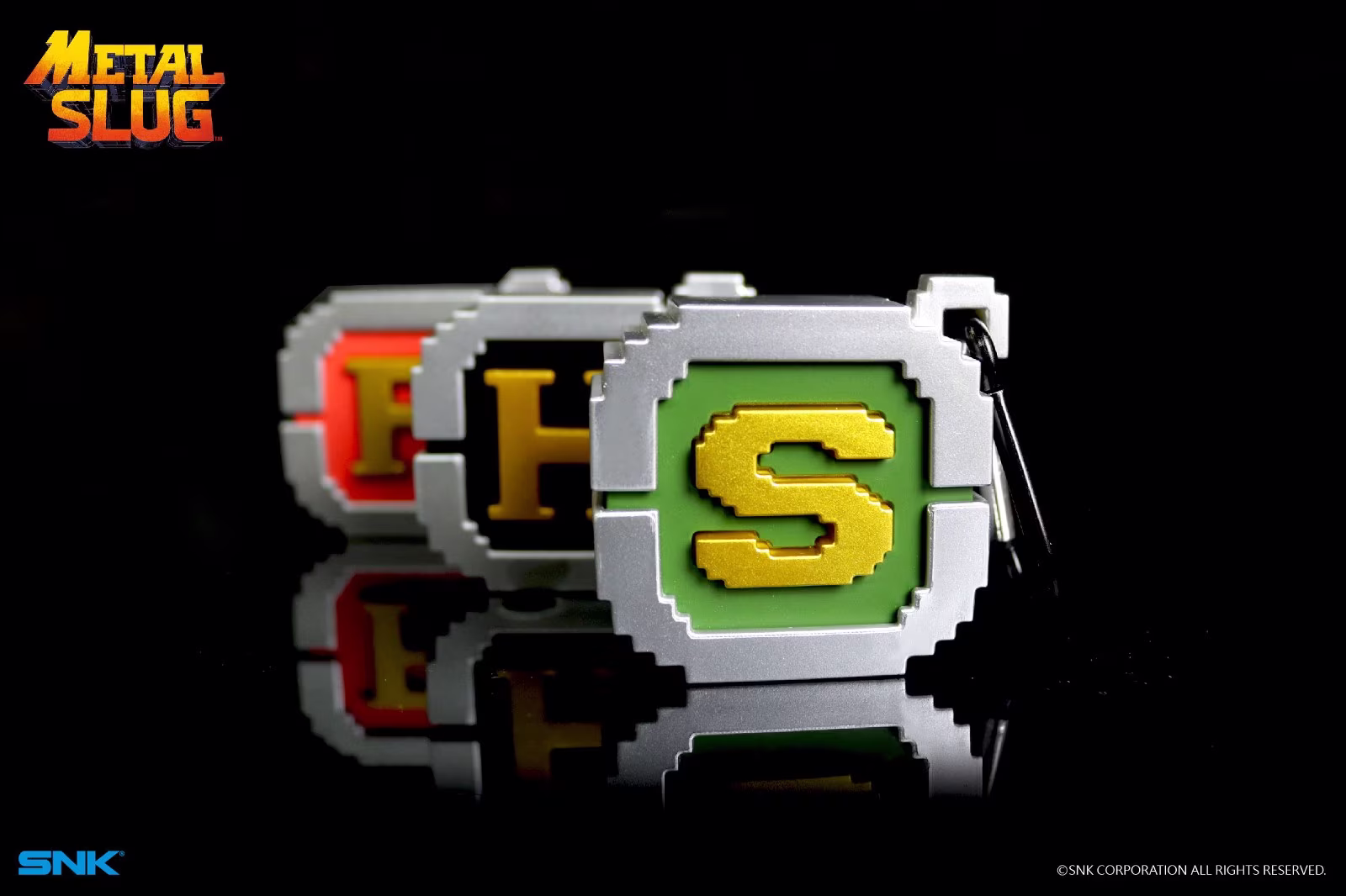 《合金彈頭立體有聲 H、F、S 彈藥箱玩具》共有三種經典款式:H 彈藥箱、F 彈藥箱和 S 彈藥箱,中間字母分別代表著 Heavy Machine Gun、Flame Shot、Shot Gun,只要按壓中央的英文字母,就可以聽到熟悉的道具音效「黑比某遜槓」、「蝦槓」等,瞬間喚起少年時代單純的歡樂。