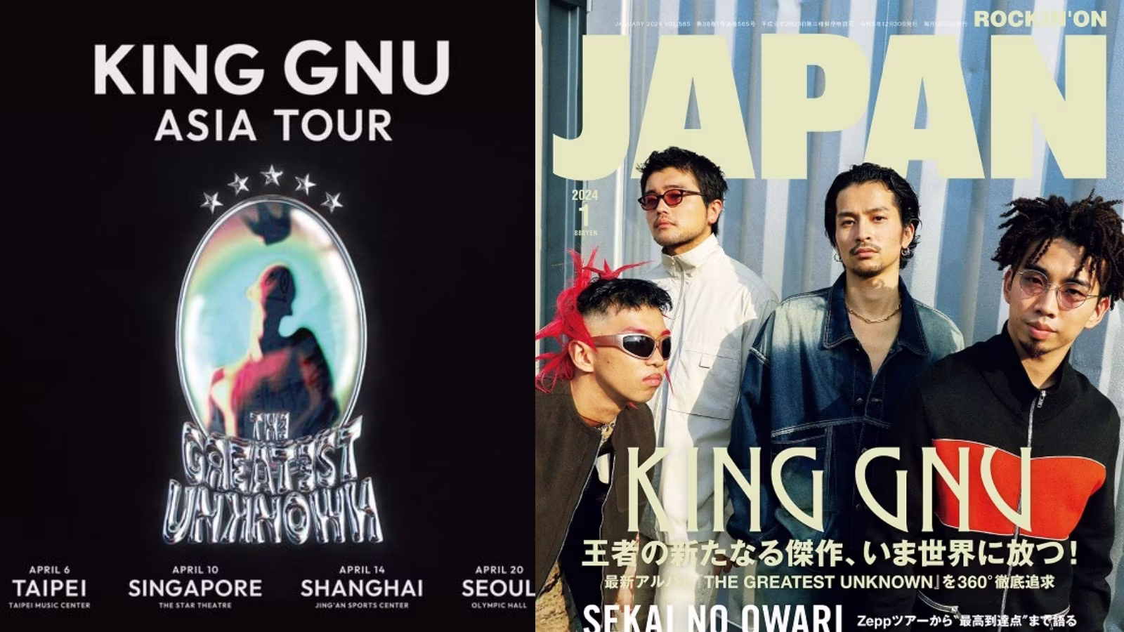 King Gnu 11 月底第四張新專輯《THE GREATEST UNKNOWN》拿下日本告示牌「Billboard Global Japan Songs Excl. Japan」冠軍,收錄的〈SPECIALZ〉拿下美國、巴西、英國、法國和南非熱播排行第一。