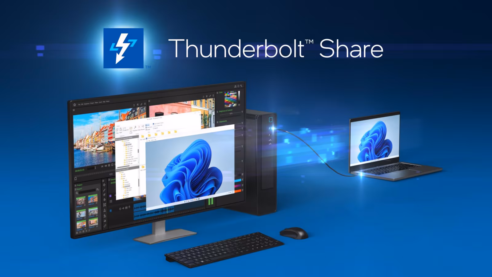 Thunderbolt 介面除了擁有龐大的傳輸頻寬,Intel 再推出 Thunderbolt Share 軟體,透過單一傳輸線連接並操控另一台 PC,預計向容於 Thunderbolt 4 / Thunderbolt 5 介面。
