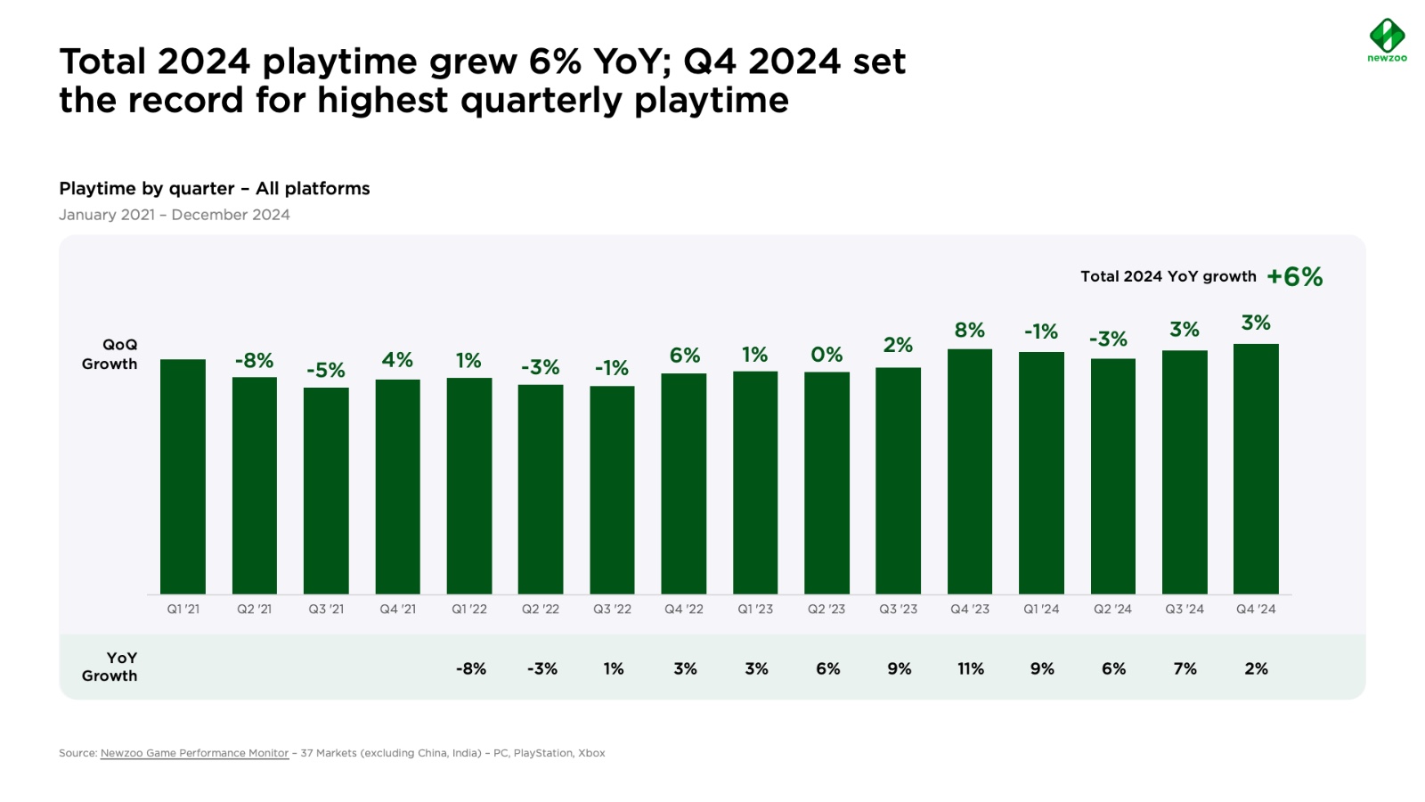 根據市調機構 New Zoo 所公布的最新報告,2024 年玩家們在遊戲中所投入的時間比去年增長了 6 %,當中 PC 和 Xbox 的玩家數量沒有太大變化,PS5 玩家倒是增長了 21 %,不過機構沒有解釋背後用戶群體變化的原因。