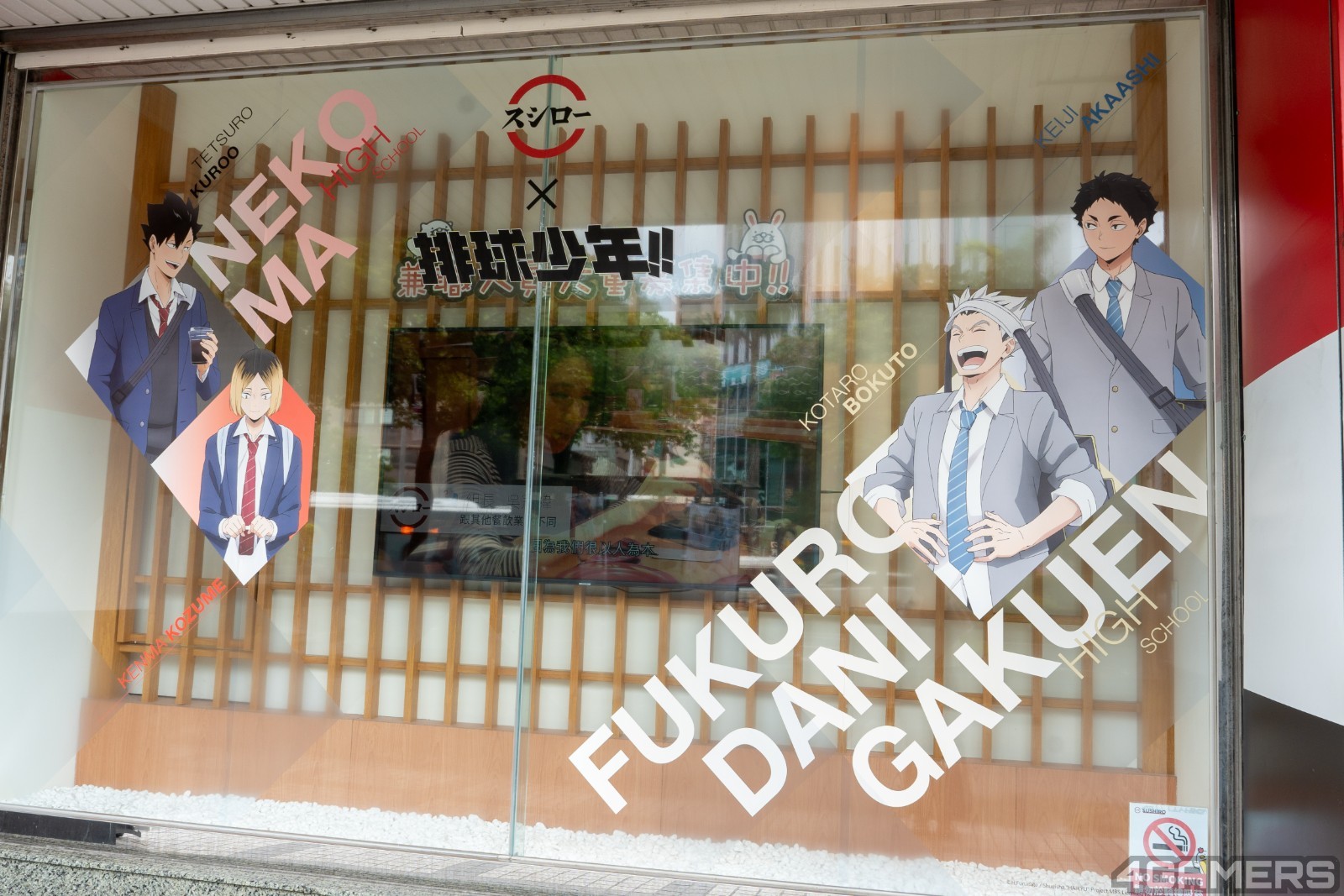 本次聯名活動為期 26 天,從 4/23 至 5/18 分為活動上下半期,活動於全台壽司郎店面舉行,在全台北中南還有 5 家壽司郎×《排球少年!!》主題店,今天 4Gamers 也前往其中之一的「壽司郎台北中華路店」訪問。店門口裝飾有梟谷、音駒、烏野、青葉城西,兩邊玻璃上也能看到本次主視覺主角群!