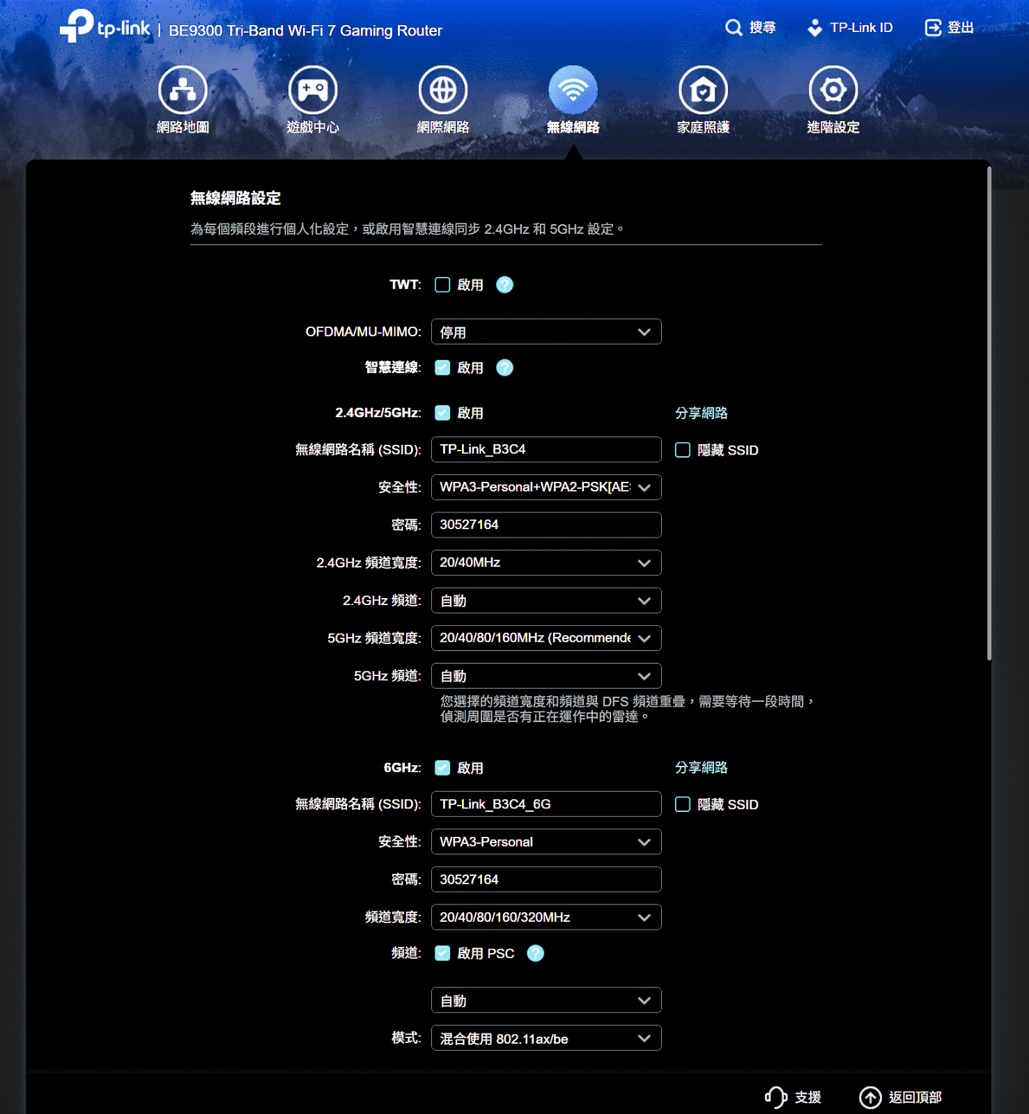「無線網路」功能頁面中,讓使用者可自行設定各個無線網路頻段的 SSID,2.4/5GHz 則提供有智慧連線功能,只需要一個 SSID 就可以依據裝置連線狀態,自動連線至最佳的無線頻段,省去多個頻段設定的麻煩。另外,像是 OFDMA & MU-MIMO 功能、MLO(多重連接模式技術)或是訪客網路 SSID、IoT 裝置用的網路等設定,也都可以透過這個頁面自行設定。