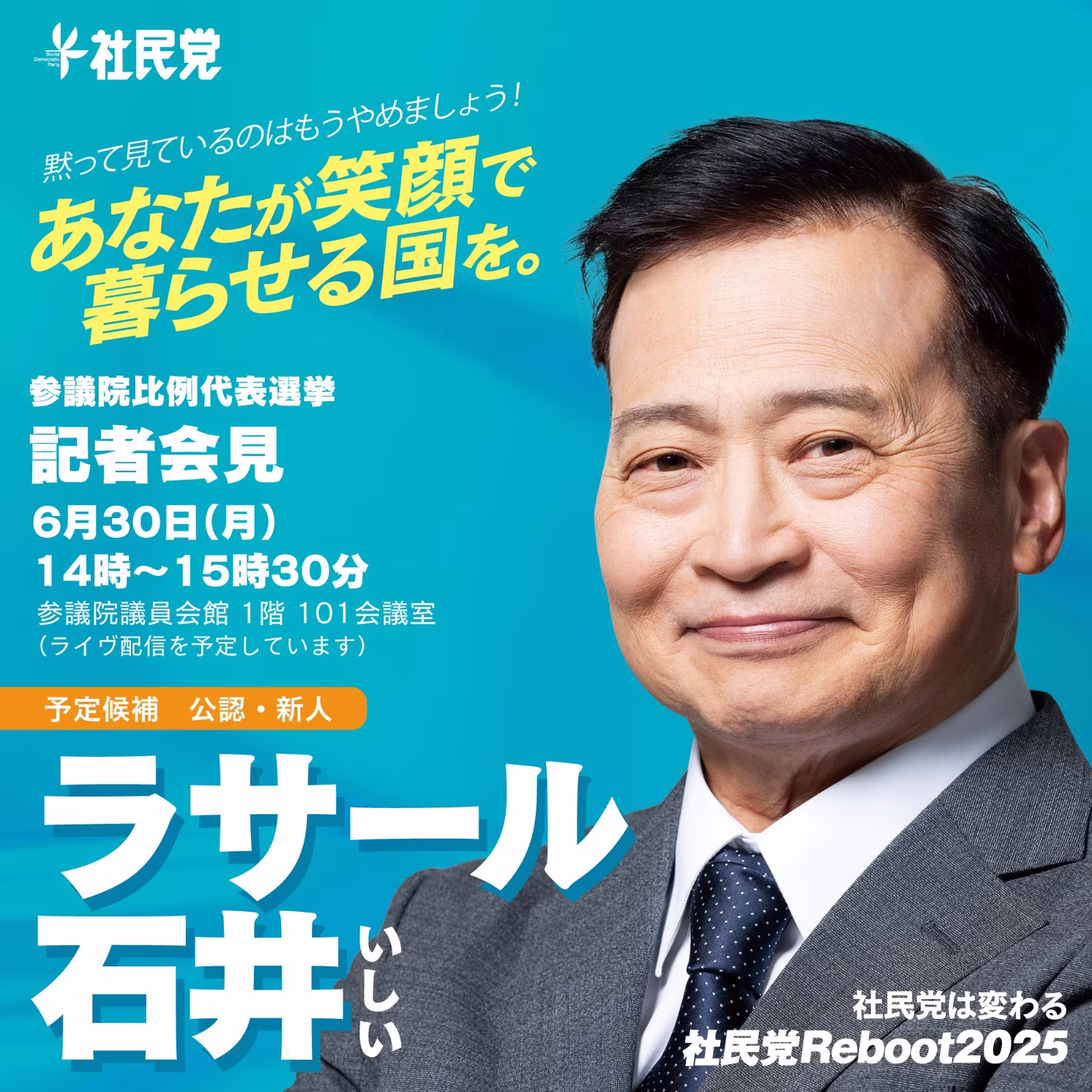 社會民主黨的主旨是「自由・平等・共生・和平」,主張應以民生為優先,提倡食料品消費稅歸零、最低工資提高到 1,500 日圓等。而根據拉沙爾石井過去發表的政見,他對在日外國人持開放態度,與參政黨主張的「日本人優先」相悖。