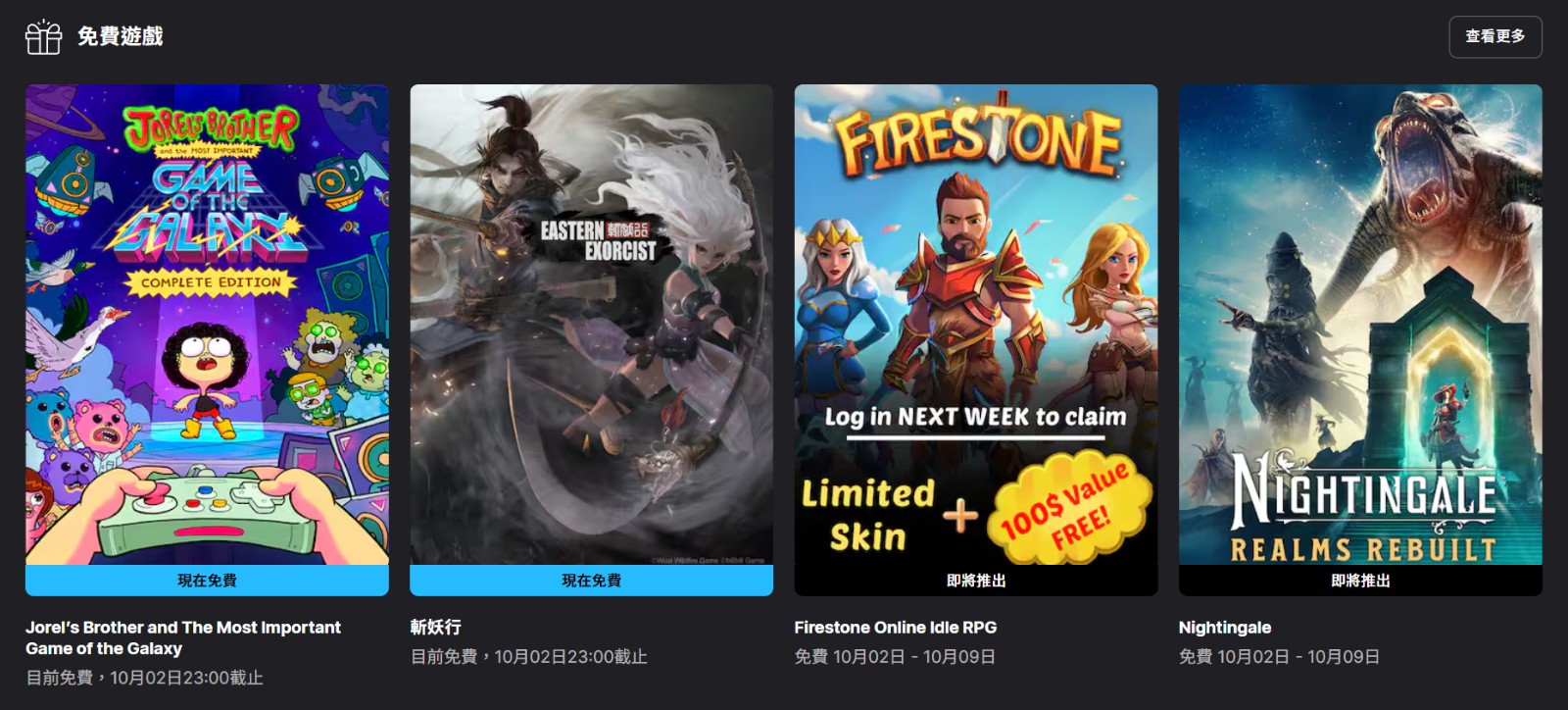 Epic Games 商店的《斬妖行》與《喬雷爾的兄弟與全銀河最重要的遊戲》限時免費期限只到 10 月 2 日晚上 11 點;同時,EGS 預告下周送出免費遊戲《火之石 - 放置英雄RPG》禮包,以及《夜鶯傳說(Nightingale)。